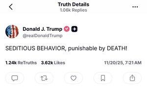 来自总统的死亡威胁。 又一次提醒民主党人,现在不是表现友好的时候。这不是一个礼貌的时刻。我们不能就这样表现得好像这很正常。