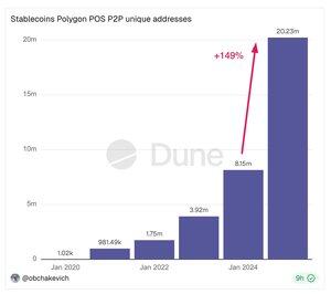 在@0xPolygon上,独特的点对点稳定币地址数量在2025年增长了149%。 在2024年全年,这类地址的数量达到了810万,而在2025年,仅用11个月就超过了2000万。 在2025年,@0xPolygonEco采取了一些重大步骤来发展其支付生态系统,与@Mastercard、@Visa和@Revolut等金融科技巨头进行了多项关键合作。此外,使用Polygon作为支付通道的项目数量也有所增加。 因此,我对这种点对点交易的增长并不感到惊讶。