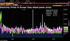 来自德国的早上好,德国在欧洲面临着重大的竞争劣势。从2024年开始,这里的能源价格一直高于其他主要欧盟国家。明天,电力的价格将是每兆瓦时132欧元——是西班牙价格的三倍,比法国高出75%。