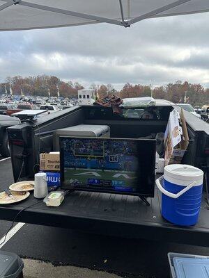第一次用 @cybertruck 尾门聚会,表现得非常出色。 @Starlink 安装完毕。电视、电煎锅和Starlink都轻松供电。