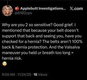 一个账户给我弟弟提供了不请自来的建议,我们都对一个名为Applebutt的账户想要被认真对待的想法感到好笑,然后她(他?)称我们敏感,接着就把我们拉黑了 只在𝕏上 🤣