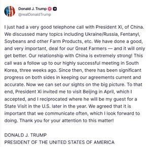 突发消息: 特朗普将在四月访问北京的习近平 🇺🇸🇨🇳