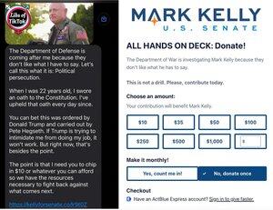 LOL。民主党参议员马克·凯利显然在发送消息乞求资金,因为@DeptofWar宣布正在考虑对鼓励美国军队违抗特朗普和赫格塞斯命令的行为进行潜在的军事法庭审判。