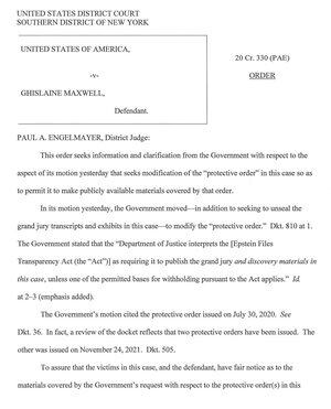 爱泼斯坦案卷:今天下午,南区纽约的法官恩格尔梅耶对司法部要求解封的第二个命令,不仅包括转录本,还包括在美国诉吉斯莱恩·麦克斯韦尔案中的证据材料。他希望在明天中午之前,提供更多关于案卷的细节。内城新闻对此进行了报道。
