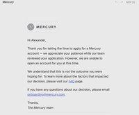 Mercury是最快拒绝申请的。Slash以相同的回应排在第二。Chase迅速通过电话联系我,纠正提交的文件,并在20分钟后批准了申请。Altitude通过电子邮件联系我,要求进行更正和额外的商业活动证明请求,并在第二天批准了。