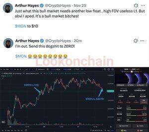 Arthur Hayes刚刚说:"把$MON送到ZERO。" 但就在两天前,他还在说"$MON到$10。"