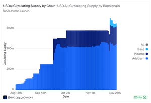 尽管最近在 @base 上对 @USDai_Official 的市值进行了增加,但网络上流通的 USDai 仅约为 3000 万美元。 @arbitrum 仍然是主要场所,持有大约三分之二的流通供应量。 目前 USDai 的总市值约为 6.47 亿美元。