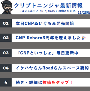 クリプト忍者最新信息11/28版 ⏤⏤⏤⏤⏤⏤⏤⏤⏤⏤⏤⏤⏤⏤⏤ ①今天CNP毛绒玩具开始发售 ②CNP Reborn迎来了三周年🎉 ③「与CNP一起」每日更新中 ④Ikahaya和Road的空间摘要 ⑤CNN第878件以0.03ETH成交 以下,各种信息来源继续🔽 感谢您一直以来的💖🔁!