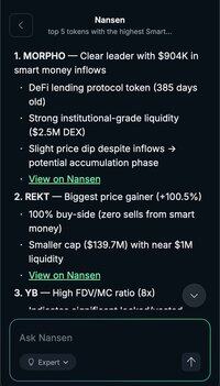智能资金本周转向了这5个代币: $MORPHO 以约 904K 美元的流入量领先 接下来是 $REKT、$YB、$SHFL 和 $ONYC。