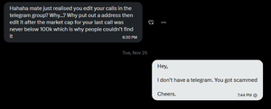 真不敢相信我必须发这个帖子: 最近有人揭发我在我的电报频道里诈骗人。 我被抓到在tg上编辑消息,误导人们购买低市值币。 谢天谢地,我没有电报频道。 祝你周日愉快!