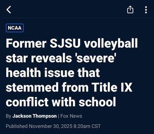 一名男性运动员被放在了@SJSU女子队。学校对女性撒谎,从未透露他是男性。布鲁克在意识到自己与一名男性同住并在团队旅行中共享酒店房间后发声。为此,媒体、新闻机构和她的教练都对她进行了抨击。她成了敌人。这名男性运动员据称密谋对她进行身体伤害,因为她发声了。
