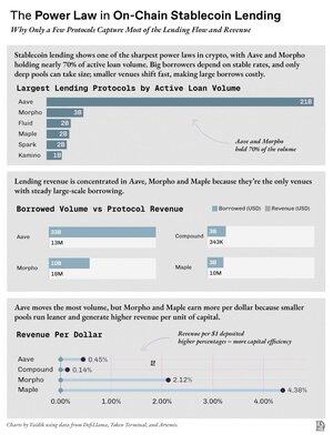 稳定币借贷在加密货币中具有最强的幂律之一,Aave 和 Morpho 几乎占据了整个市场的 70%。
