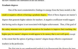 受过更多教育的教师 = 更差的结果 研究表明,拥有硕士学位的教师实际上会导致学生成绩更差 正如作者所说,"硕士学位的高薪似乎是花费不当的资金" 来源:NBER
