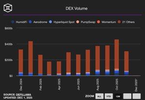 在十月创下年度高点($456.5B)后,十一月的月度去中心化交易所(DEX)交易量急剧下降,下降了33%,降至$307B,损失近$150B的总交易量。