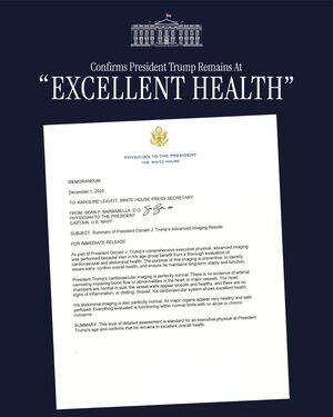 唐纳德·J·特朗普总统的高级影像结果: “他的心血管系统显示出极好的健康状况……并确认他整体健康状况良好。” — 海军上尉肖恩·P·巴巴贝拉,医学博士 总统医师