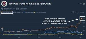 突发消息:根据 Polymarket 的数据,白宫经济顾问凯文·哈塞特成为下任美联储主席的几率飙升至创纪录的 81%。 特朗普总统表示,他已经选定了下任美联储主席,并将 "很快" 公布。 一个新的货币政策时代即将来临。