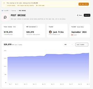 🚨 @jackfriks 的 SaaS 在 TrustMRR 上出售 🚨 👋 要价 140 万美元 📈 每月独立访客 36K 🤑 最近 30 天收入 1.86 万美元 (+31% 月环比) 有关该报价的更多细节如下。