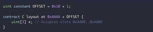 ▫️Solidity 编译器的 0.8.31 版本进一步扩展了存储布局说明符的功能。现在可以在基槽表达式中使用常量变量,如下所示: