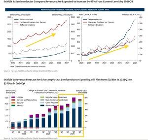 在投资方面,他们表示:“与AI相关的投资增长依然强劲,特别是在半导体公司,股权分析师预计到2026年底,收入增长将从当前水平增长47%。收入预测修正意味着半导体支出将从2025年第三季度的2580亿美元上升到2026年第四季度的3790亿美元。”