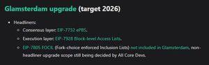 Glamsterdam 是下一个主要的 Ethereum 升级 📆 目标时间 2026 🔝 头条新闻: * 共识层:EIP-7732 ePBS。 * 执行层:EIP-7928 区块级访问列表。 (1/3)