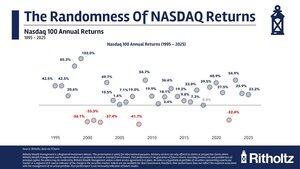 自1995年以来,纳斯达克100指数仅有5个下跌年份 值得注意的是,这些损失每一次都超过了30%: 2000年:-36.1% 2001年:-33.3% 2002年:-37.4% 2008年:-41.7% 2022年:-32.4%