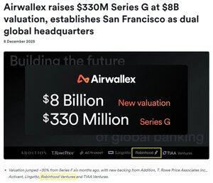 看起来 Airwallex 是新成立的 Robinhood Ventures 基金中的首批投资之一 > 供您参考:RH 在九月份为该基金提交了注册声明,并将在此之前进行首次公开募股。封闭式基金将为零售公众市场提供对一系列领先的后期私人公司的投资组合的访问。