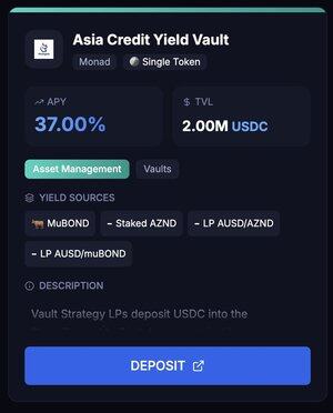 现在在@monad上可能是最高的稳定收益:@MuDigitalHQ与@sharpbytexyz合作的亚洲信用收益金库提供37%的收益。 实际的$USDC收益为5%,同时在Merkl上还有17%的$WMON激励,其余为积分。