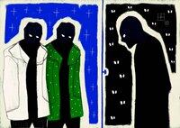 - 最后在提取路径中,这一组现在出现在书中,你可以看到三个身影。左侧,两个身影穿着与门相呼应的长外套,体现了所呈现的选择。右侧,另一个身影站着,在一扇门前犹豫,被一个高大的白色身影包围,正在与同样的决定斗争。所有三个身影代表同一个人,处于选择的门槛上。