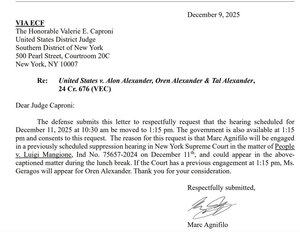 对于那些询问的人,似乎 Marc Agnifilo 将于 12 月 11 日星期四回到 Luigi Mangione 的辩护席上(下面是给 @SDNYLIVE 的 Caproni 法官的信,案件为 US v. Oren Alexander)。有人说他 12 月 8-9 日的缺席与 Roger Ng / Jho Lo 案件、马来西亚 1MDB 有关。