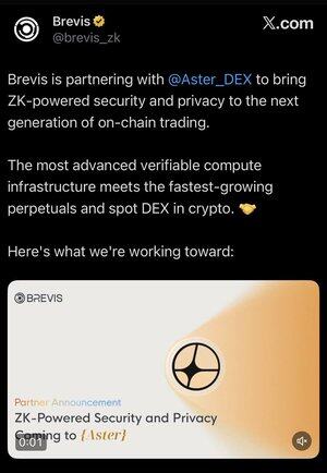 Aster(@Aster_DEX) 拥有快速的链上交易环境,而 Brevis(@brevis_zk) 提供基于 ZK 的验证和隐私基础设施。