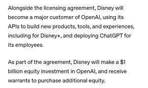 作为交易的一部分,迪士尼正在向OpenAI投资10亿美元。