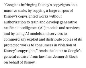 迪士尼已向谷歌发送了一封停止和终止信,指控他们大规模侵犯版权。 '立即停止进一步复制、公开展示、公开表演、分发和创作迪士尼版权角色的衍生作品'