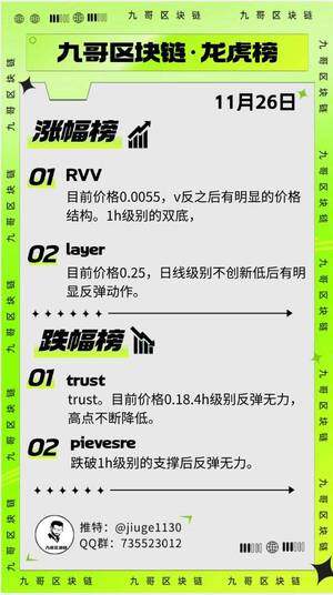 11月26日龍虎榜 龍榜(關注做多的表的) 1、 $RVV 目前價格0.0055,v反之後有明顯的價格結構。1h級別的雙底, 2、 $layer 目前價格0.25,日線級別不創新低後有明顯反彈動作。 虎榜(關注做空標的) 1、 $trust 目前價格0.18.4h級別反彈無力,高點不斷降低。 2、 $pievesre 跌破1h級別的支撐後反彈無力。
