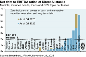 "Meta 的淨負債/EBITDA 比率在年初為負(即現金多於長期負債);到第三季度上升至 6.6%;在包括其 2025 年 10 月的 300 億美元債券發行後進一步上升至 37%;在合併其 Hyperion 責任後上升至 63%" - JPM 的 Cembalest
