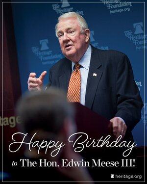 傳承基金會祝我們法律與司法研究中心的名字來源——著名的保守派領袖、思想家和政治家,尊敬的愛德溫·米斯(Edwin Meese)——生日快樂!