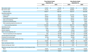 - 第三季度營業收入為 174 億美元,與 2024 年第三季度的 174 億美元相比。2025 年第三季度的營業收入包括兩項特殊費用——25 億美元與聯邦貿易委員會的法律和解有關,以及 18 億美元的預估遣散費,主要與計劃中的職位裁減有關。如果不計這些費用,營業收入將為 217 億美元。
