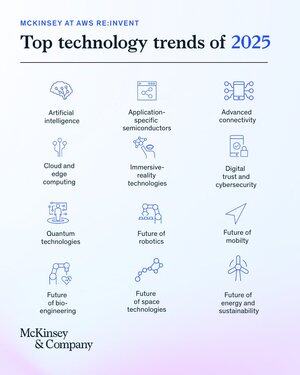 2025年哪些技術將最為重要? 我們的科技趨勢報告分析了人工智慧、網絡安全、移動性和機器人技術的重大變化。了解更多,並隨著我們深入這些主題,關注AWS re:Invent。 #McKinseyAtReInvent #AWSreInvent