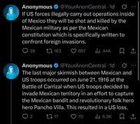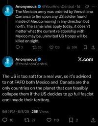 Anonymous 說,如果我們試圖阻止卡特爾,墨西哥軍隊將會打敗我們,然後墨西哥和加拿大將聯合入侵我們並接管。