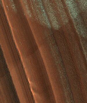 在八月由火星勘測軌道器拍攝的北極層狀冰沉積物表面的塵埃。顯示的區域大約有一公里寬。
