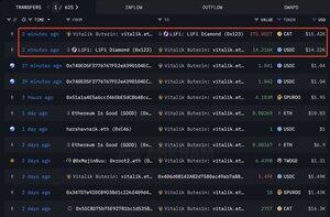 vitalik.eth(@VitalikButerin) 再次出售他免費獲得的迷因幣,現金提取 14,216 $USDC。