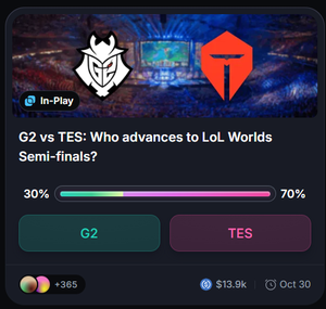 如果你參加了 @MyriadMarkets 的巨大 500M 積分活動,為 LoL 世界賽選擇你的隊伍! 今晚我們有 G2 對 TES。大多數預測者都看好 TES,但我喜歡 G2 的賠率(30%)。 這場比賽是即時的 USDC 市場。不要害怕在比賽中途更換隊伍。