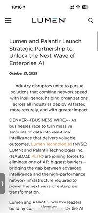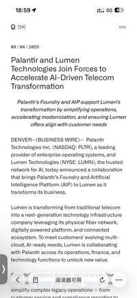 第二: $pltr 和 Lumen $LUMN 開啟了戰略合作,這一點很有趣,9月10月,兩個月,兩條合作,9月還是合作,10月就 “Strategic”了。(圖2 3)