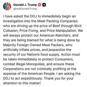 TRUMP 說一些肉類包裝公司正在推高牛肉價格