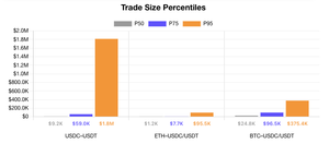 BTC 和 ETH 的交易規模百分位數保持穩定,但穩定幣對的增長超過 3 倍,這可能反映了由波動性驅動的套利。每週獨特交易者數量為 1.7k。