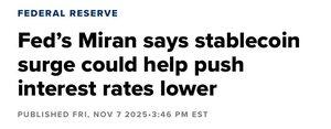 穩定幣正創造“影子貨幣市場”,米蘭的這個觀點也很有意思,美聯儲理事斯蒂芬·米蘭(Stephen Miran)週五在紐約舉行的BCVC峰會上公開表示,穩定幣已成為“一股不可忽視的力量”。他認為穩定幣的廣泛使用和持續增長,可能會對美國經濟的長期利率產生“下行壓力”。