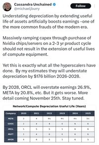 《大空頭》投資者邁克爾·伯里指控主要科技公司 $ORCL $META 透過延長設備的使用壽命來虛增利潤。