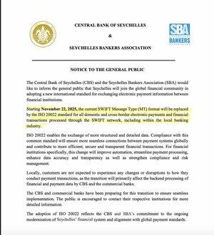 ‼️塞舌爾中央銀行:自2025年11月22日起,當前的SWIFT格式將被ISO 20022標準取代‼️ 已記錄。📝👇