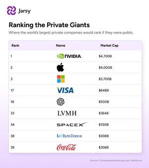 如果 OpenAI、SpaceX 和字節跳動今天上市,它們將與 Visa、LVMH 和可口可樂等全球巨頭並駕齊驅。 這是投資者在將自己限制於公開市場時錯過的機會規模。