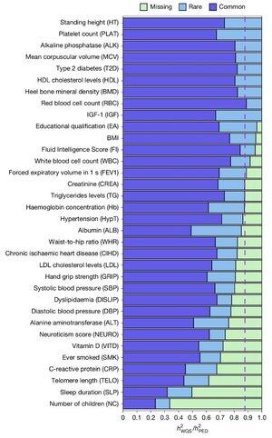 這是一篇關於人類特徵遺傳性的里程碑論文👇 使用來自35萬名英國生物銀行參與者的全基因組測序數據,該研究顯示,稀有(>0.01%)和常見(>1%)變異體在編碼和非編碼區域中幾乎解釋了所有(平均88%)的遺傳性(根據親屬估算)在34個特徵中。