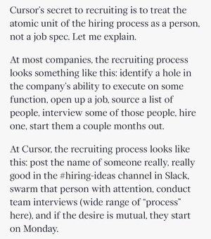這就是如何聘用一組超級明星的方法。人員優先,角色/流程其次。 有很多方法可以將拼圖組合在一起,但你要優先考慮頂尖人才,這是最重要的。處理非標準化流程的混亂比找到並說服頂尖人才要容易得多。 - 來自 @zebriez 的優秀文章《Colossus》,標題為「Inside Cursor」